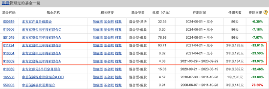 天天基金数据显示,截止8月23日,自张锋任职以来的回报,该基金的B份额回报率为-33.01%,A份额回报率-23.59%。此外,张锋此前从2021年3月至2023年9月管理的东方红启程三年持有混合A,在其任期内同样亏损高-33.97%。数据显示,东方红启恒三年持有混合基金在三年的时间里亏损高达61亿元,超过了其当前总资产的一半。基金亏损严重,但期间依然还收取了高达4.7亿元的管理费。