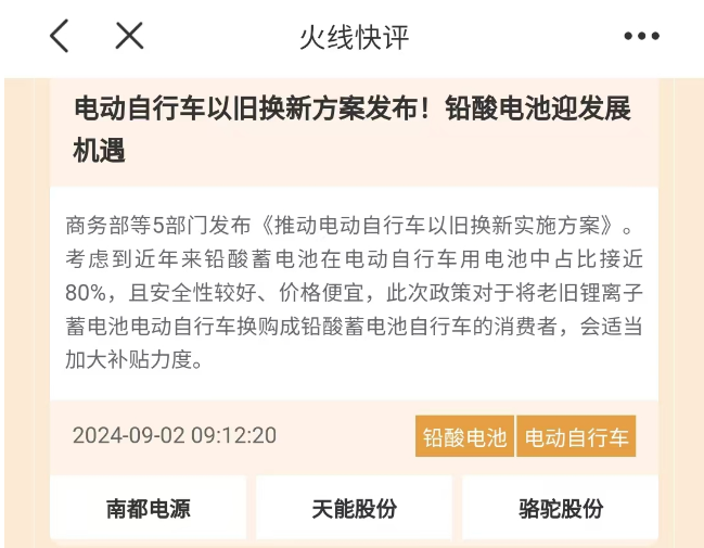 在每日经济新闻APP私人订制的“火线快评”中,在周一开盘前,提到了铅酸电池板块,相关个股南都电源表现强劲。
